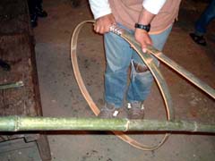 竹削りと並行して、大蛇山の骨組みを組み立てていきます。 写真は胴になる部分を作っているところ。 胴の部分は強度が要求されるので、太い竹を使います。 太ければ太いほど力がいるので大変です