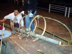 大蛇山の背骨に位置する竹に、先日作った胴の輪をつなげていきます。 この工程で強度や全体像が決まるので、力のいる作業ですがみんな慎重に作業を進めていきます。