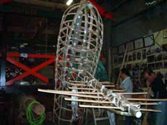 上あごを形づくる竹が入りました。 まだ、大蛇山の形には程遠いのですがですが、この段階で完成形をイメージしています。 これから、一番長い竹の先端を曲げたりして、唇のめくり上がった感じを出したりするのです。 ここは、大蛇山の印象が変わってくる大事な工程です。 どんな感じに仕上がっていくのか楽しみですね。