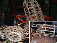 上あごの骨組みは、ほぼ完成! わらを刺しやすいように、先端も尖りました! と、同時に胴の部分も出来ました。お祭りの時にはなかなか見かけない胴なのですが、ちゃんと山車の真ん中についてますよ!